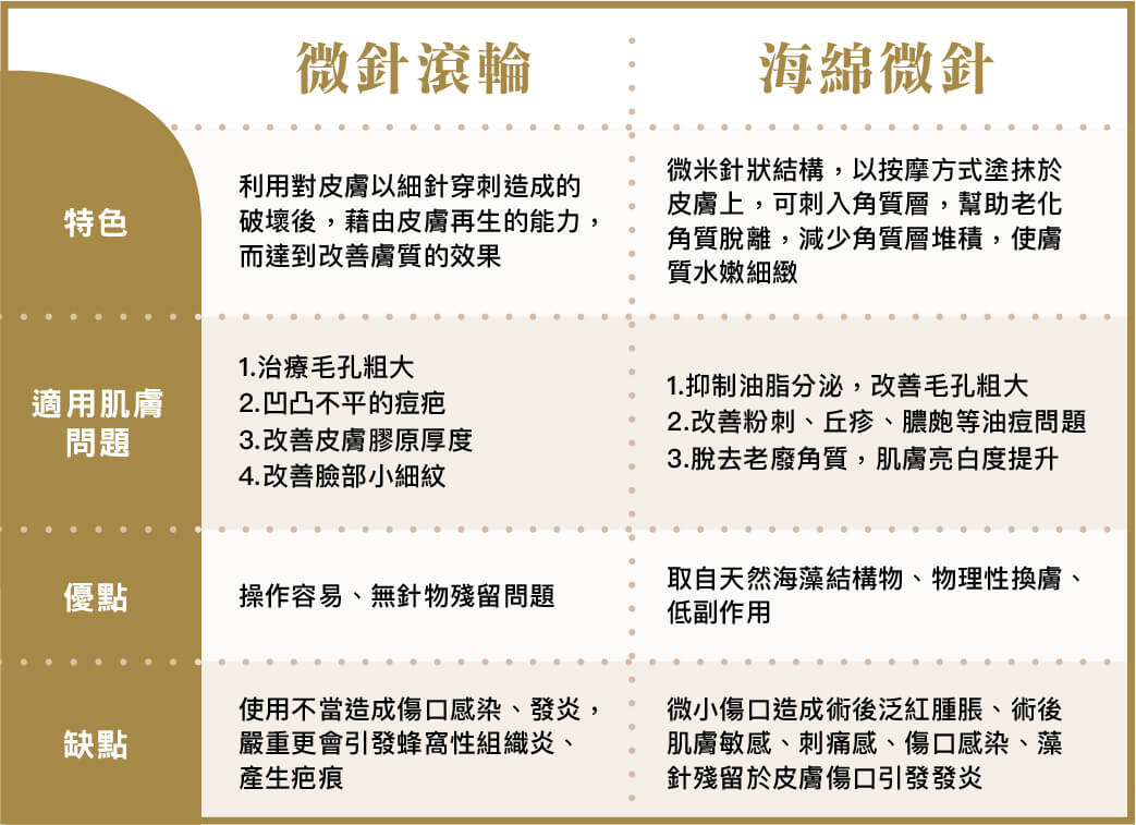 療程中可以看到,在塗抹藻針前會先增加皮膚保水度,是為了軟化角質,讓海綿微針能更有效的去除老舊角質。此外,此療程不須似微針滾輪需要消毒程序(因為沒有出血)。術後,患者皮膚會持續紅腫一段時間,此時要注意不可使用刺激性的保養品(如美白訴求之保養品),避免過度刺激肌膚產生過敏。去除角質後,可增加肌膚吸收保養品中有效成分的效率,但可能不及微針滾輪的效果,畢竟微針滾輪對皮膚造成的通道較深。