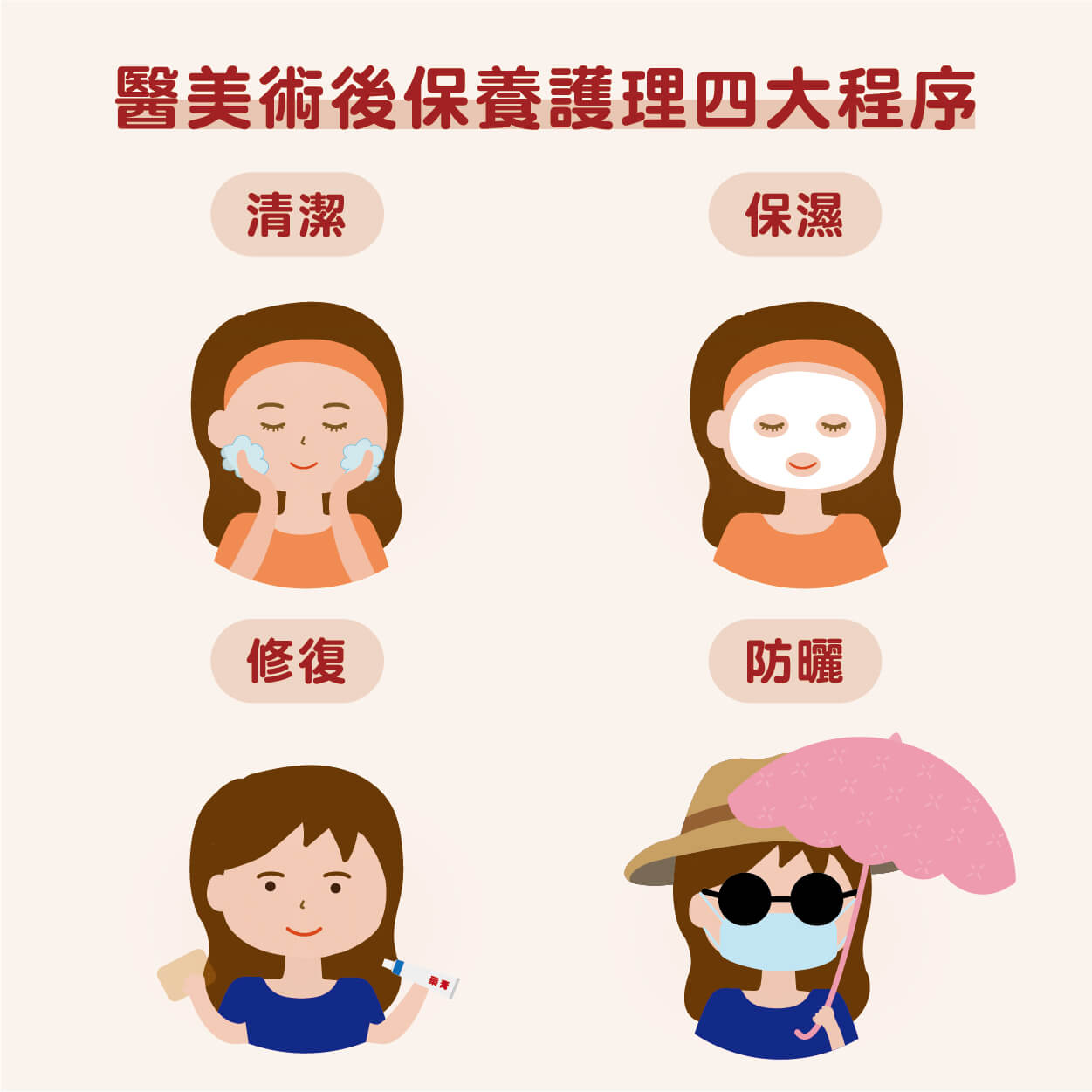 術後的保養是非常重要的,為了不要事倍功半,以下列出保養護理四大程序: