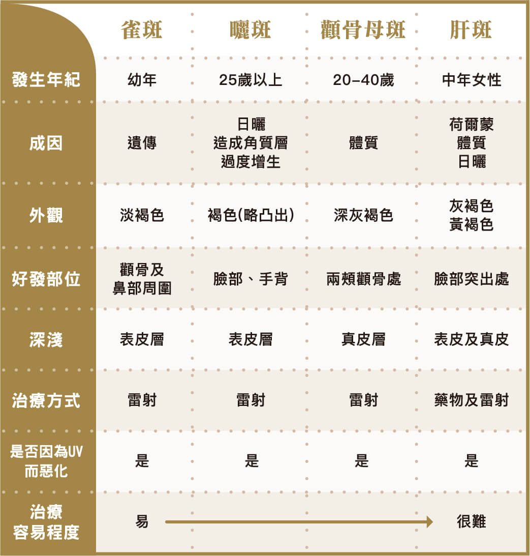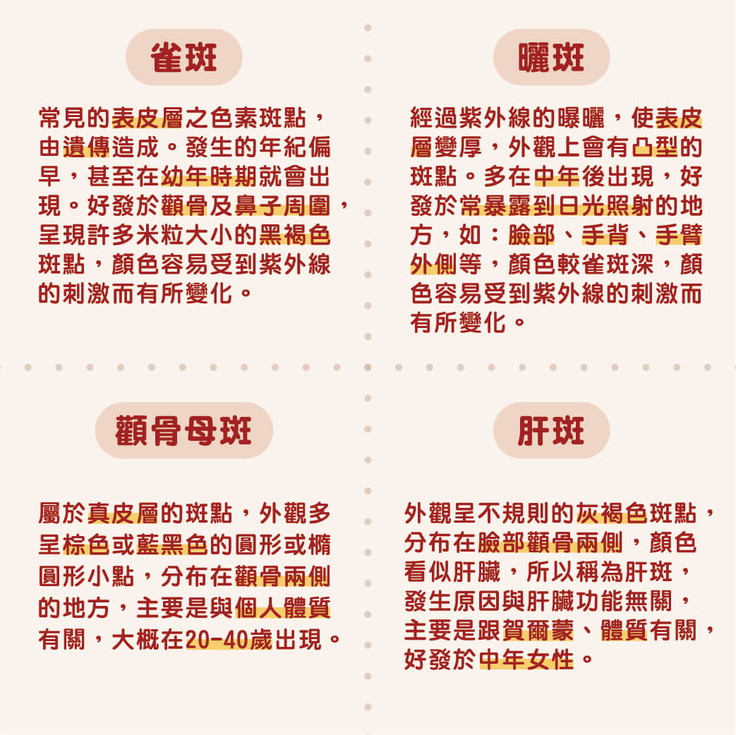 在了解斑是怎麼產生之後,那已經產生的斑點該如何治療呢?斑點又分哪一些種類呢?不同斑點有不同治療對策: